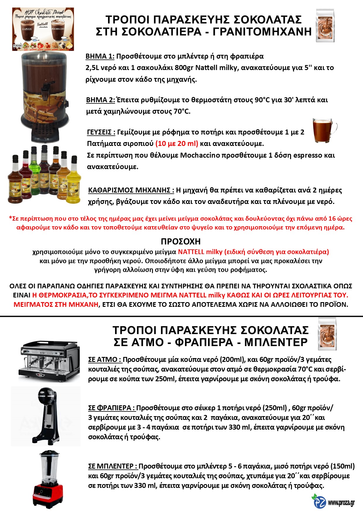 ΠΡΟΣΟΧΗ: χρησιμοποιούμε μόνο το συγκεκριμένο μείγμα NATTELL milky (ειδική σύνθεση για σοκολατιέρα) και μόνο με την προσθήκη νερού. Οποιοδήποτε άλλο μείγμα μπορεί να μας προκαλέσει την γρήγορη αλλοίωση στην ύφη και γεύση του ροφήματος.
